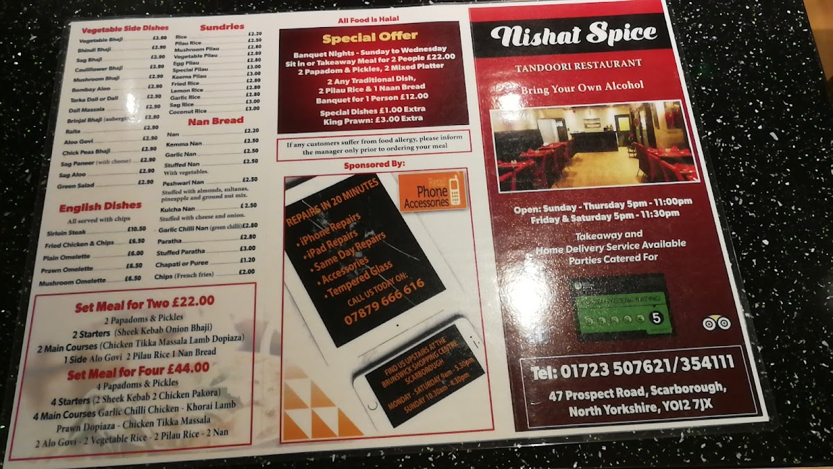 Welcome to Nishat Spice Tandoori, a culinary gem nestled in the heart of Scarborough, UK. Located at 47 Prospect Rd, Scarborough YO12 7JX, this charming eatery brings the rich and aromatic flavors of Indian cuisine straight to your plate. With a phone line open for inquiries at +44 1723 507621, they are always ready to address your cravings for authentic dishes.